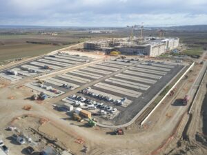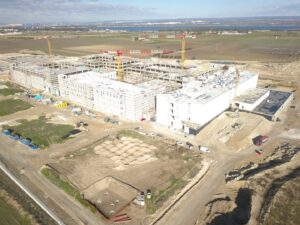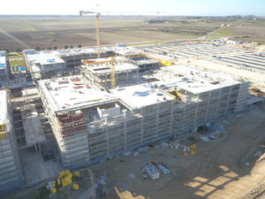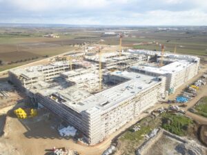 Il progetto riguarda la costruzione del nuovo Ospedale “San Cataldo” di Taranto, la cui struttura è costituita da un’unica piastra rettangolare interrata. L’edificio si compone di un asse centrale denominato “hospital street” a cui si innestano 4 corpi a C e un altro pressocché rettangolare.